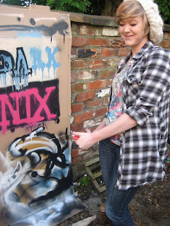 After our taster session in the days previous, we noted that the effect of spray painting on the corrugated metal surface gave a much cleaner look and had greater impact than the other brush painted pieces on the wall. The only problem being that only a small amount of the group had ever picked up a spray can before. We decided to have a spray paint tester session today where we opened out large boxes and stuck them together to make a large surface on which to paint on. Those who had sprayed before helped the others and I think we all definately showed signs of improvement by the end of it. Here are some of our efforts.